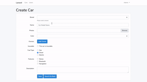 Field::make('Fuel Type')->radio(['Gas', 'Diesel', 'Electric'])->default('Diesel'),